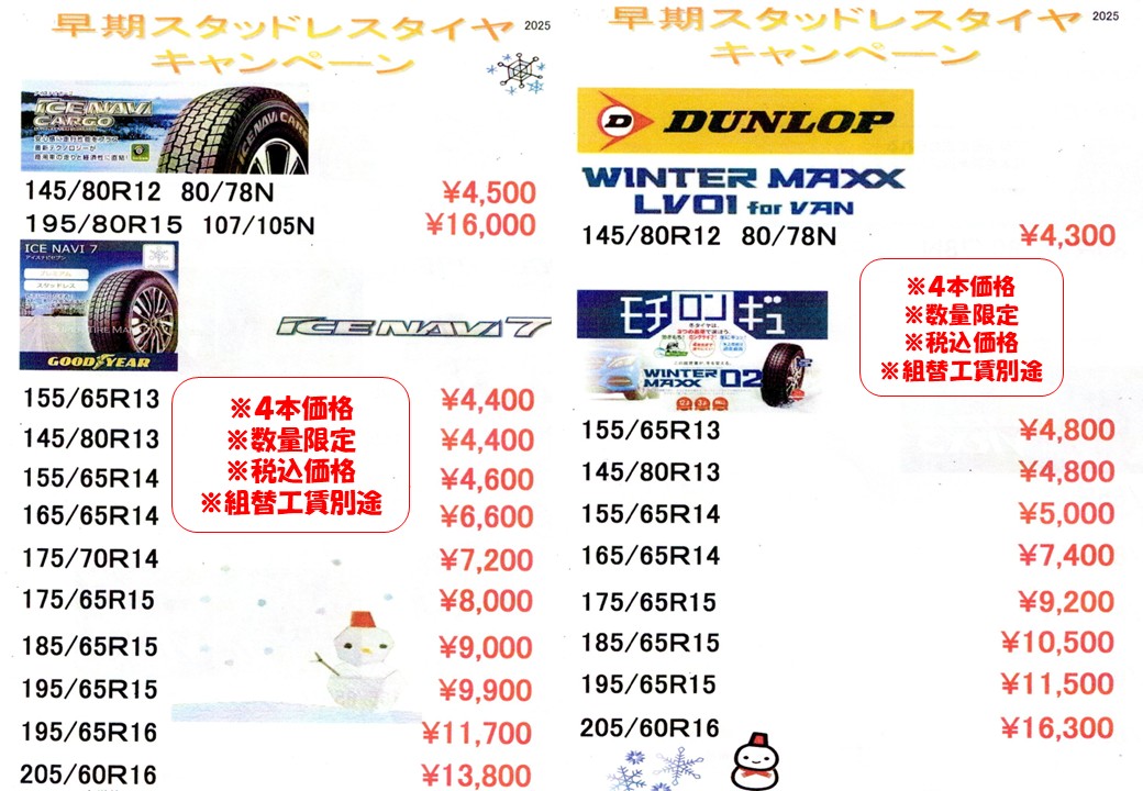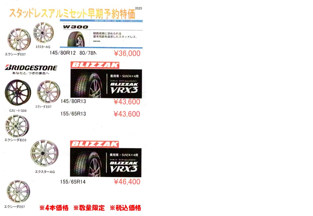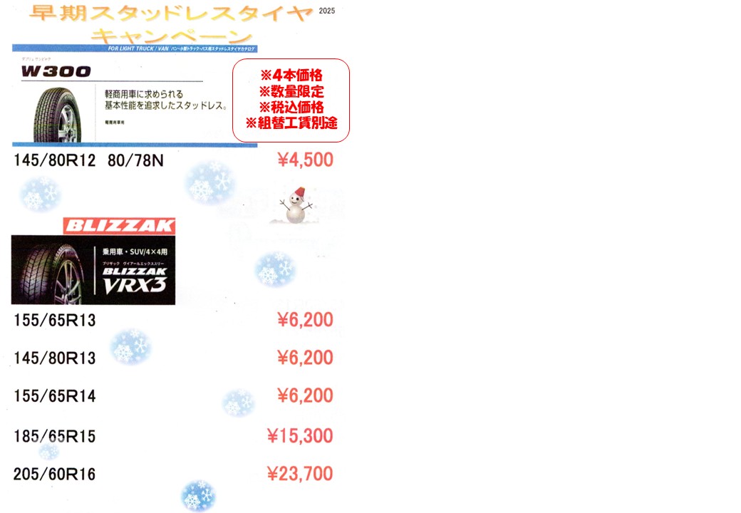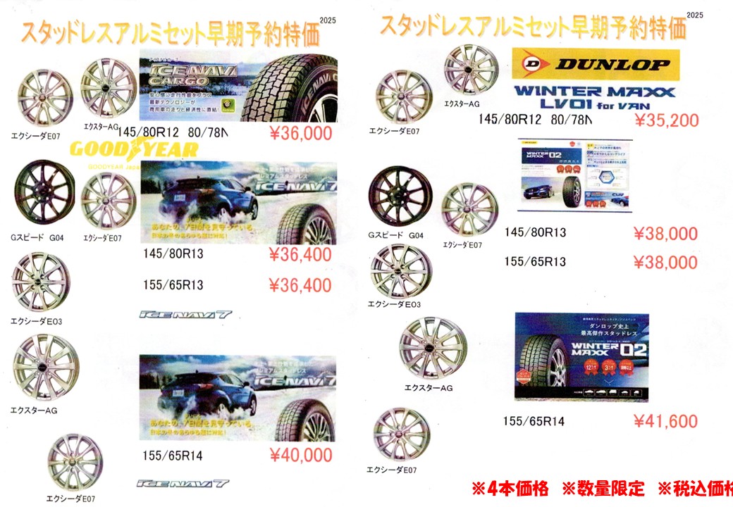 スタッドレスタイヤ、スタッドレスタイヤ&アルミホイールセット 早期予約割実施中!!